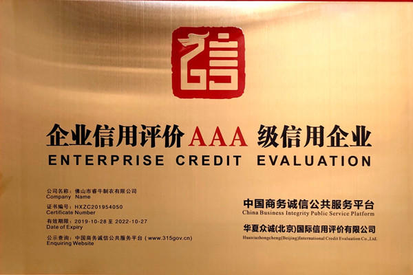 請看一下圖片:佛山市睿牛制衣有限公司——企業(yè)信用評價AAA級信用企業(yè);