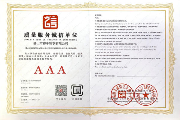 佛山市睿牛制衣有限公司——3A級重服務守信用企業(yè);