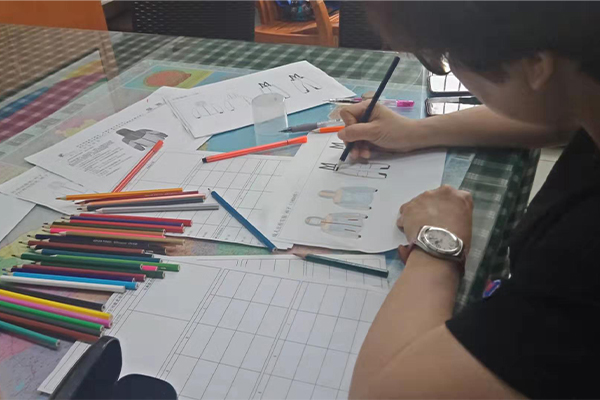 盡管困難重重,我們也要想進(jìn)一切辦法做到,不僅要做好,而且要做到最好!我們的總經(jīng)理自己也搖身一變設(shè)計師——畫稿,可以看到以下的圖片,認(rèn)真、負(fù)責(zé)的態(tài)度,用心的為客戶所思,一筆一筆的畫好,一點點的涂好顏色;還有一個紙樣哥哥也在幫忙畫,他們兩個人在一兩天的時間內(nèi)要畫好接近10個款衣服和褲子,雖然我們的時間不多,但是睿牛的小伙伴們也是很努力的去做,努力過就不曾后悔。