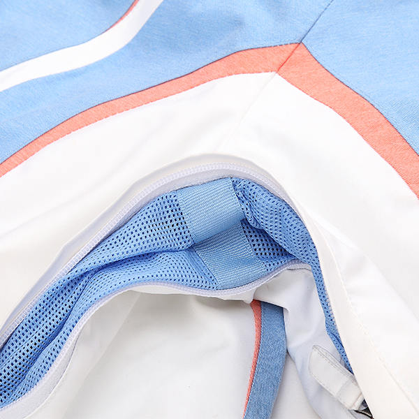有些沖鋒衣的面料整體如同單層面料,銀灰色為通常的里料顏色,里料連接部位還能看到壓膠條。另外一種沖鋒衣是由獨立的兩個分層材料縫制而成,外表層面料是通過把具有防水功能且透氣性良好材料制成有特殊保護的織物組織結構。此類外表面料的外層起防水透氣作用,內層主要起排汗作用。里料層是另一層獨立的織物,里料和面料是可分開的,里料色彩一般為暗色,主要由錦綸材料、棉纖維之類吸汗材料制成,結構主要以網(wǎng)格為主,面料的拼合部位的壓膠通常會被里料遮蓋住,只有網(wǎng)格結構的里料才能看到壓膠處。