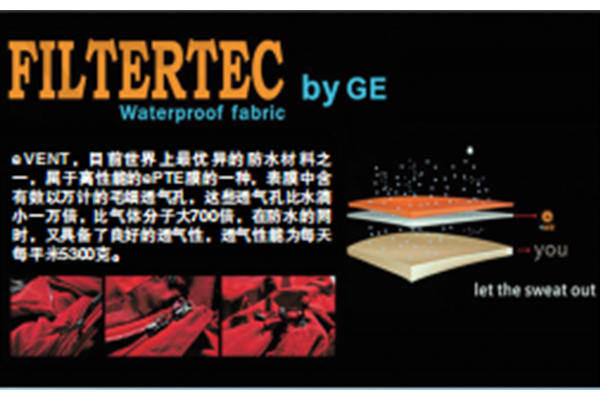 則EVENT使用了GORE-TEX面料的品牌沖鋒衣售價高達幾千上萬元,一般的戶外愛好者常常只能是“望衣興嘆”。而誕生比GORE-TEX略晚的EVENT面料的性價比似乎要高一些,兩者都被稱為頂級沖鋒衣的面料。EVENT技術上使用了與GORE-TEX完全不同的思路,它使用一種全新的EPTFE織物(不是覆膜)工藝,這種織物具有極其穩定的化學性能,適用的溫度范圍更廣,而且耐老化。面料層的小孔雖然比EPTFE覆膜的分子透氣孔大,但是依然能夠稱職地將雨水阻隔在面料外部,即使最小的水珠(霧珠)也不能輕易通過。而且擴大的透氣孔讓透氣性能幾乎與傳統織物面料沒有差別。