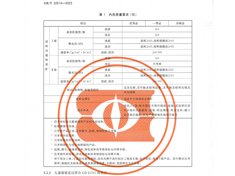 新標(biāo)準(zhǔn)增設(shè)無氟整理產(chǎn)品的檢測規(guī)范,并對兒童沖鋒衣提出更嚴(yán)格的安全要求,必須符合《嬰幼兒及兒童紡織產(chǎn)品安全技術(shù)規(guī)范》。這體現(xiàn)了國家標(biāo)準(zhǔn)對健康環(huán)保的重視,引導(dǎo)沖鋒衣加工行業(yè)向綠色生產(chǎn)轉(zhuǎn)型。