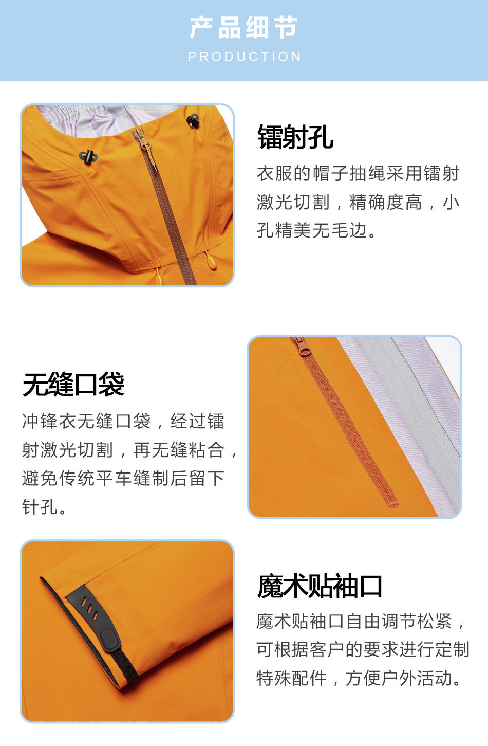 • 無縫口袋:沖鋒衣無縫口袋,經過鐳射激光切割,再無縫粘合,避免傳統平車縫制后留下針孔。