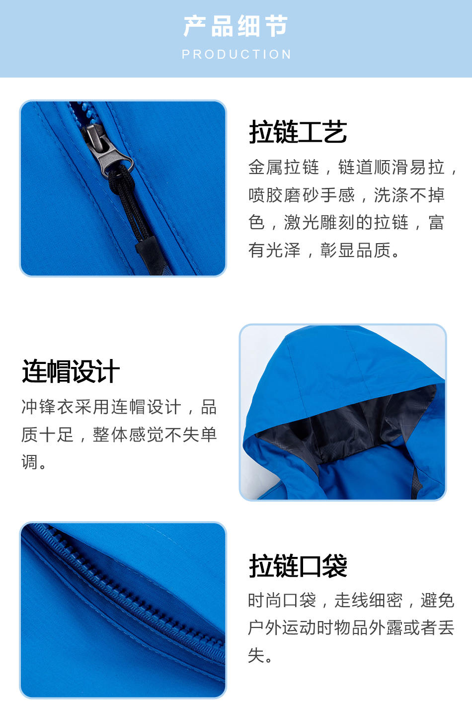 連帽設計:運動服沖鋒衣定制采用連帽設計,品質十足,整體感覺不失單調(diào)。