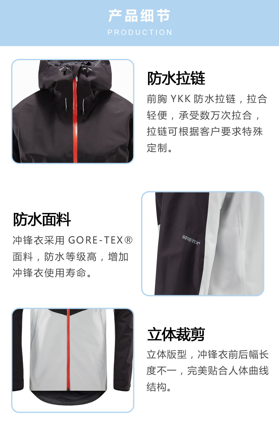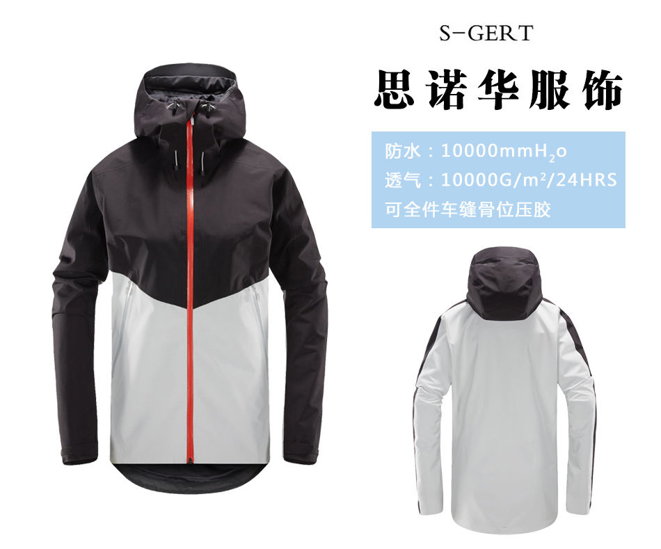 防水面料:單層沖鋒衣加工采用GORE-TEX?面料,防水等級(jí)高,增加沖鋒衣使用壽命。