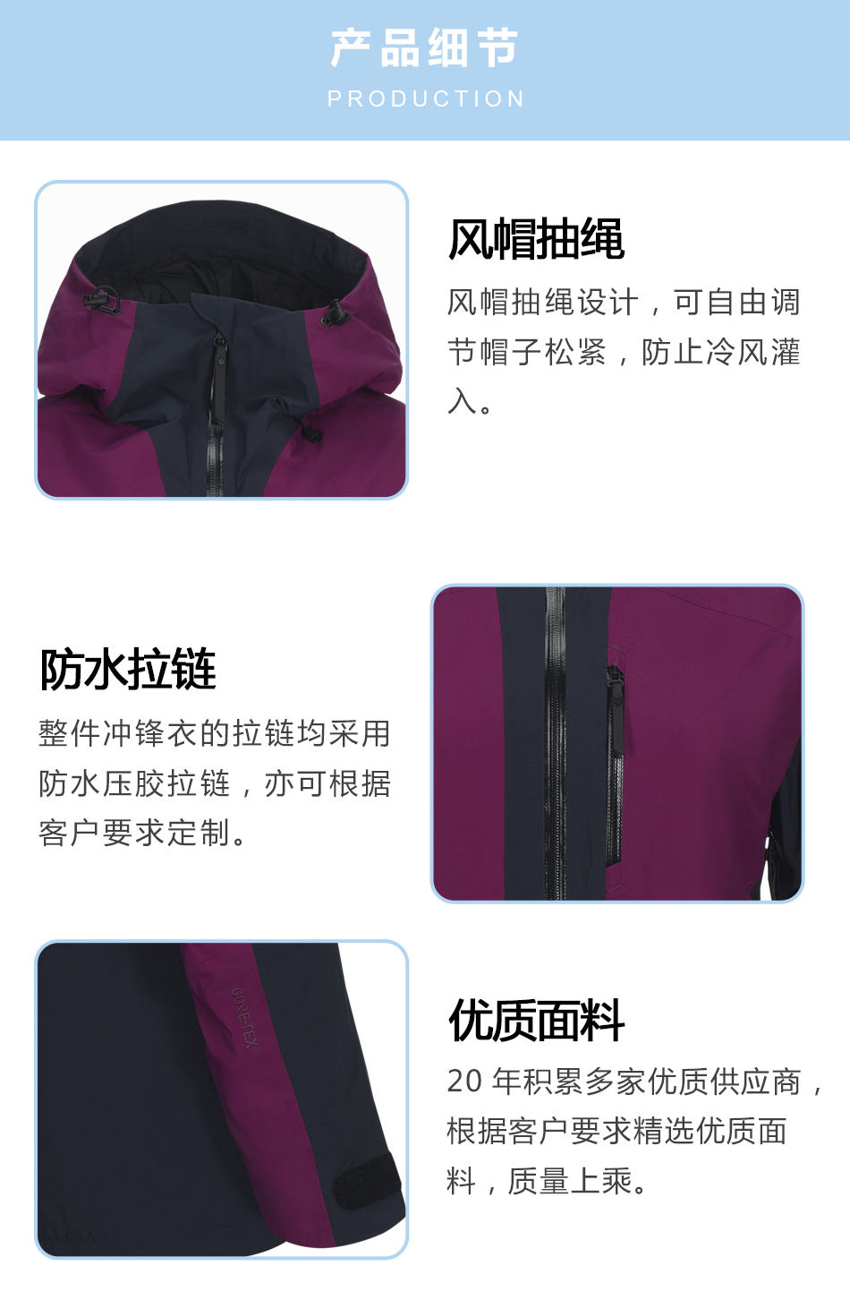 • 防水拉鏈:整件沖鋒衣的拉鏈均采用防水壓膠拉鏈,亦可根據(jù)客戶要求定制。