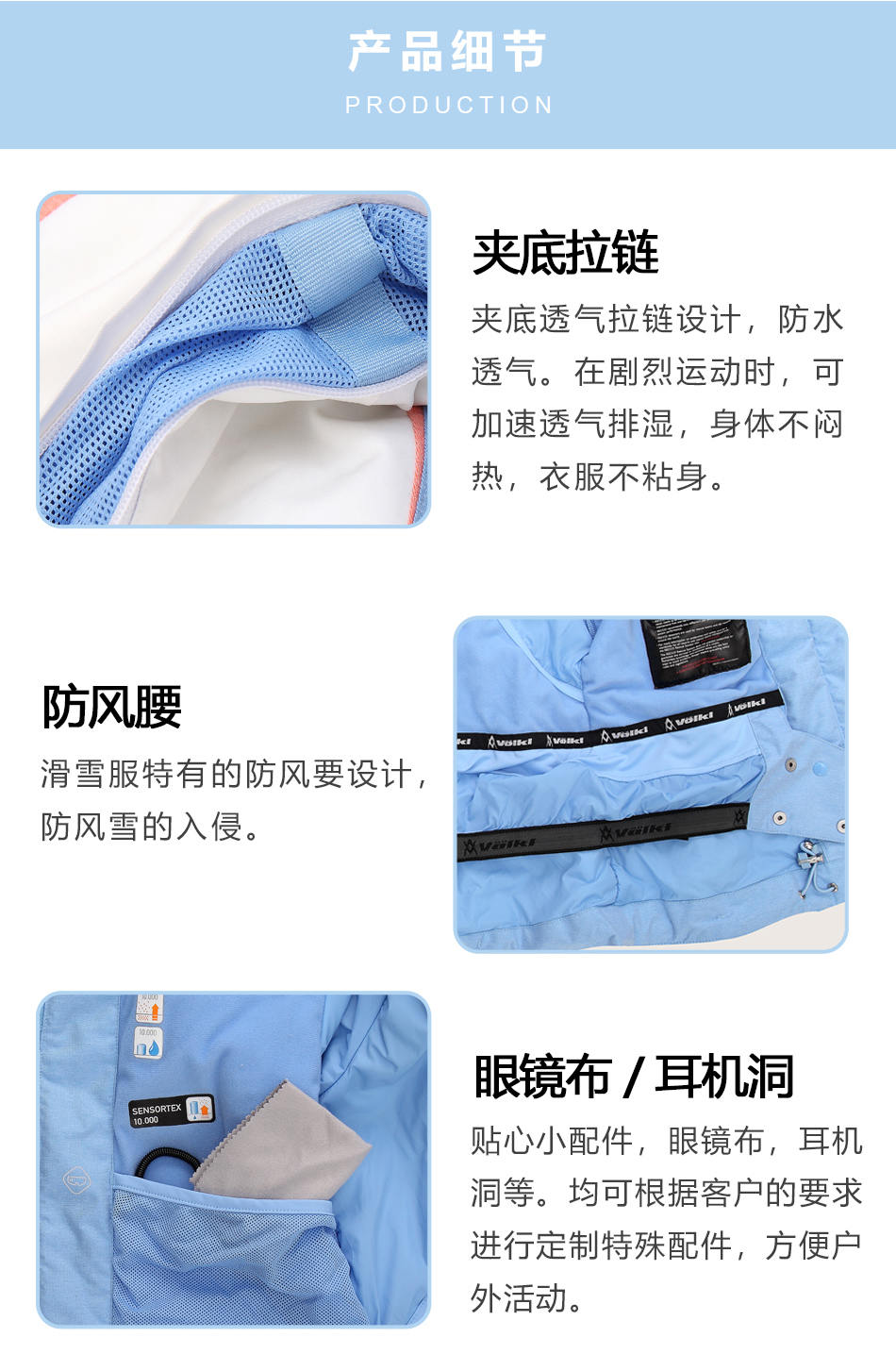 • 防水拉鏈采用無縫壓膠防水拉鏈激光熱封工藝貼合,面料采用進口防水透氣涂層膜,使防水透氣膜與面料完美結合。可根據客戶需求完成戶外沖鋒衣定制