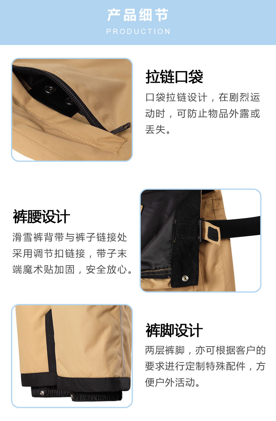 • 褲腰設計戶外滑雪褲加工的背帶與褲子鏈接處采用調節扣鏈接,帶子末端魔術貼加固,安全放心。