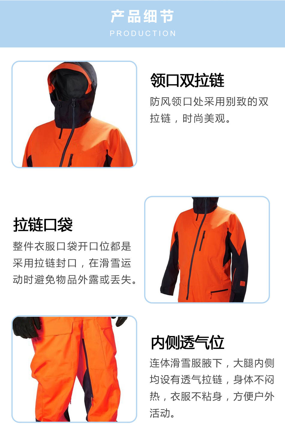 • 領口雙拉鏈連體滑雪服的防風領口處采用別致的雙拉鏈,時尚美觀。